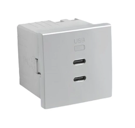 Quadro45 típusú dupla USB töltő aljzat, 2x USB-C típusú csatlakozóval, egyetlen szerelvényhelyen, alumínium színben