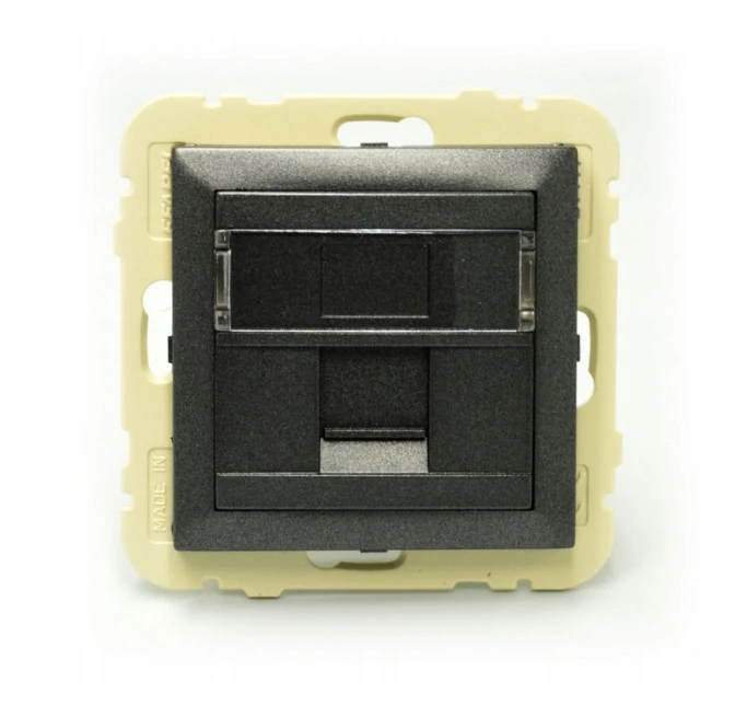 Szürke színű szimpla RJ45 szerelvény fedlappal, csatlakozó nélkül . Szabványos "Keystone" árnyékolatlan UTP, árnyékolt FTP Cat5e és Cat6 bepattintható csatlakozók csatlakoztatására.