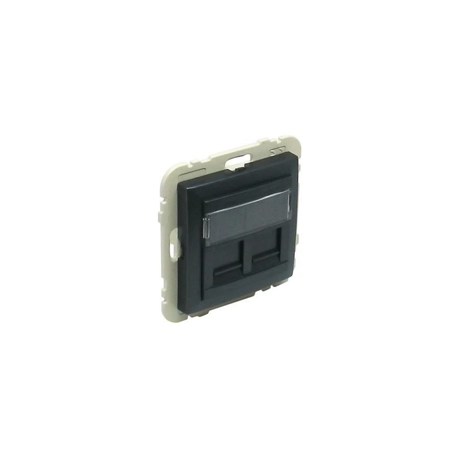 Szürke színű dupla RJ45 szerelvény fedlappal, csatlakozók nélkül . Szabványos "Keystone" árnyékolatlan UTP, árnyékolt FTP Cat5e és Cat6 bepattintható csatlakozók csatlakoztatására.