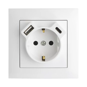 230 V-os fali aljzat beépített USB-A és USB-C töltőporttal, összesen 15 W teljesítménnyel. Praktikus megoldás hálózati és USB-s eszközök egyidejű töltéséhez vagy használatához, külön adapter nélkül. A csatlakozók egyidejűleg is használhatók, a terhelés megoszlásával. |