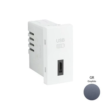 Quadro45 típusú 1 modul széles USB-C töltő aljzat, grafit színben100 - 240 V ~ | 50 - 60 Hz - 5 V 1,5 AFigyelem: a termék 1 modul szélességű, ezért a teljes szerelvény esztétikus lezárásához javasoljuk a 45973 típusú vakfedél használatát.