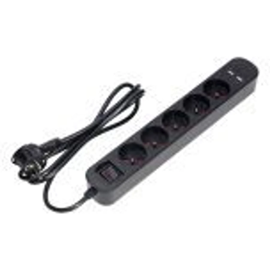 VIRONE PS-1/B/1,5M Túlfeszültség-védelemmel ellátott elosztó, 5 db 2P+F aljzat, 1,5 m-es kábel, kétsávos, háttérvilágításos kapcsoló, 10A/230 VAC, 2xUSB 2.1A, lapos csatlakozó